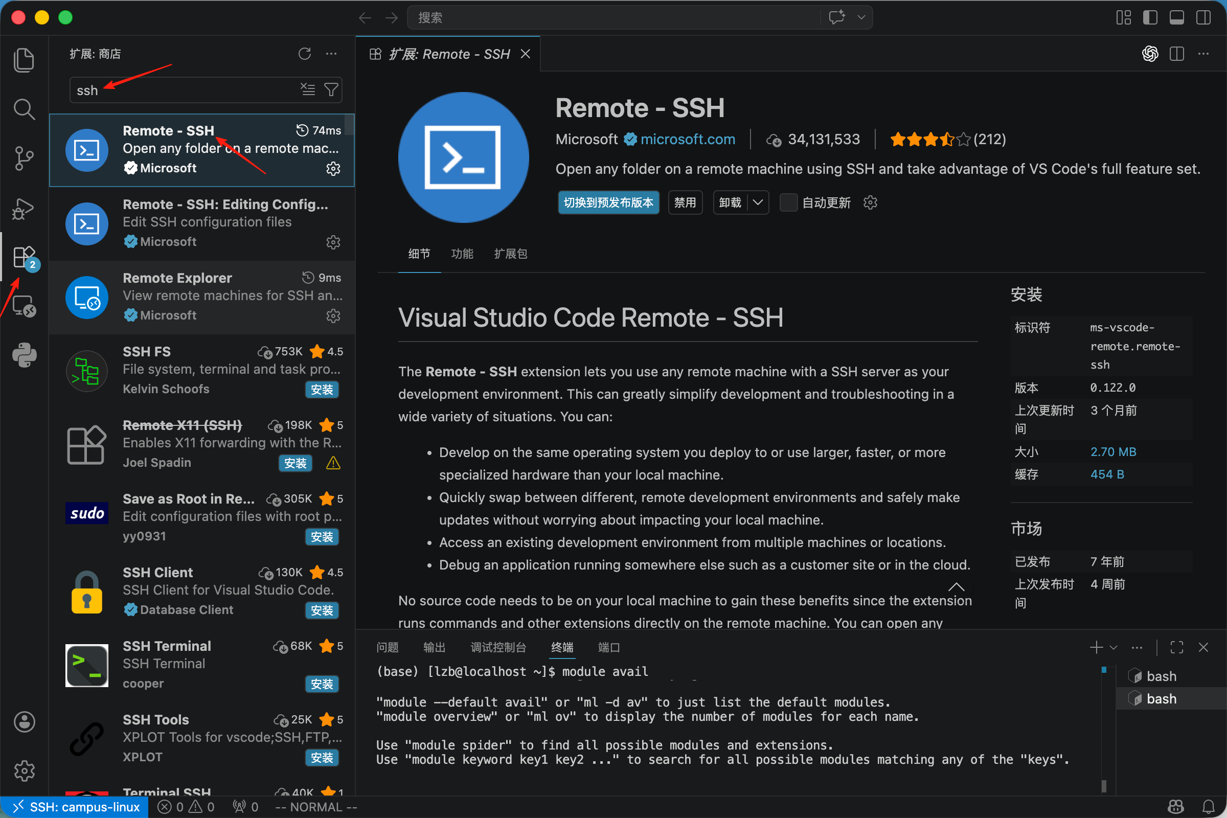 Remote - SSH通常安装 Remote Development 扩展包也可以,它会同时包含远程开发常用组件。