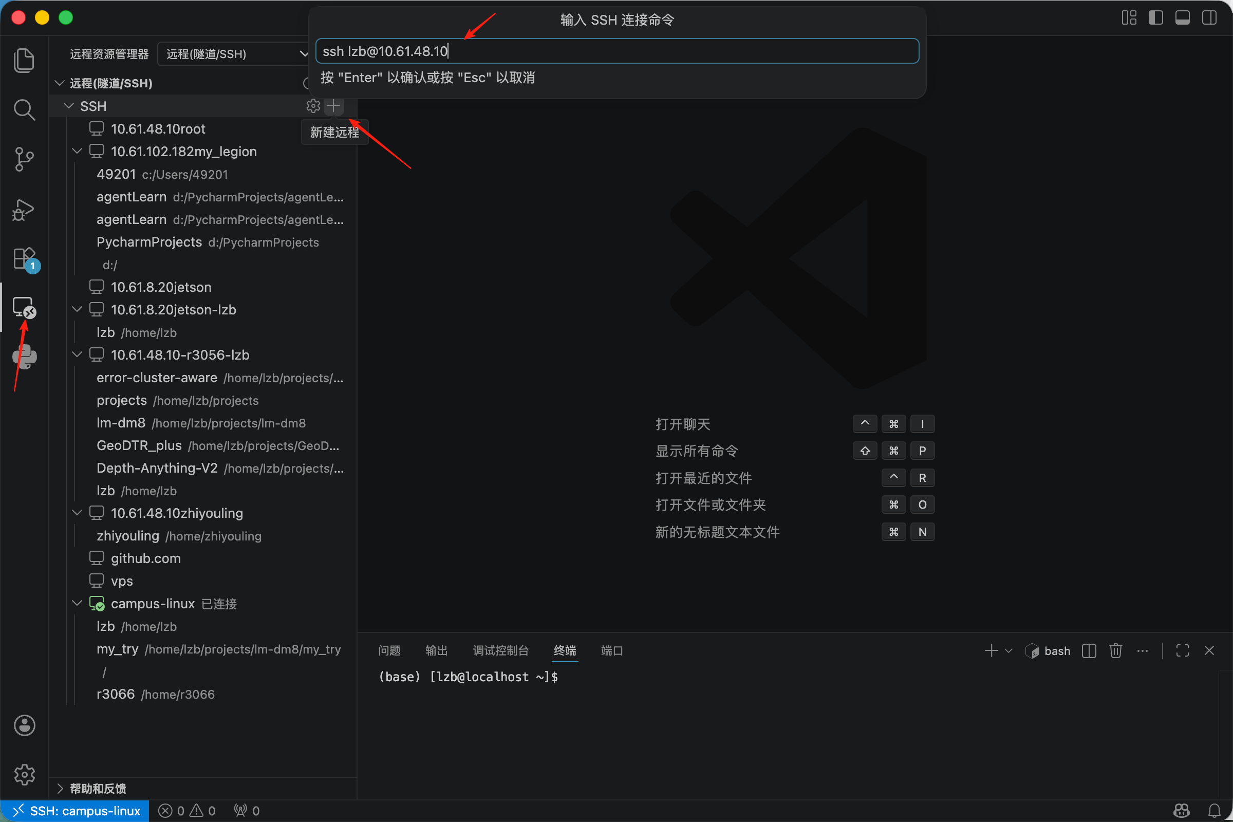 依次点击ssh插件,添加连接,输入 ssh 用户名@10.61.48.10,enter键后,出现